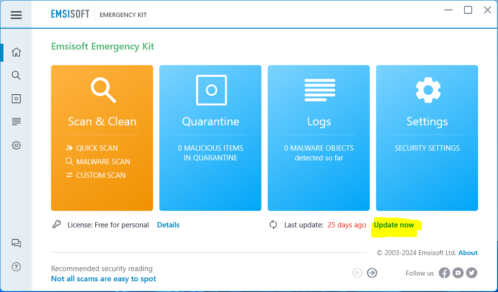 This is EEK's main program window. From here you have access to all EEK features. Before running a malware scan ensure EEK is up to date. Select the "Update now" link.