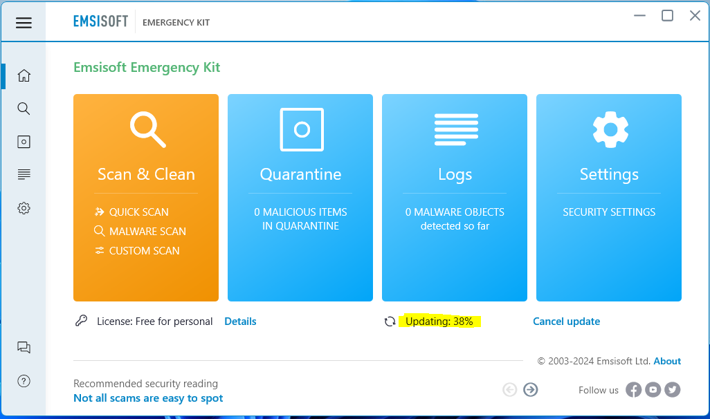The Emsisoft Emergency Kit (EEK) is a secondary supplement program to your main antivirus program (i.e. Windows Security, AVG, Avira, Avast) and should not be used as your primary antivirus program. EEK requires the user to manually open and update the program and start the malware scanning procedure.