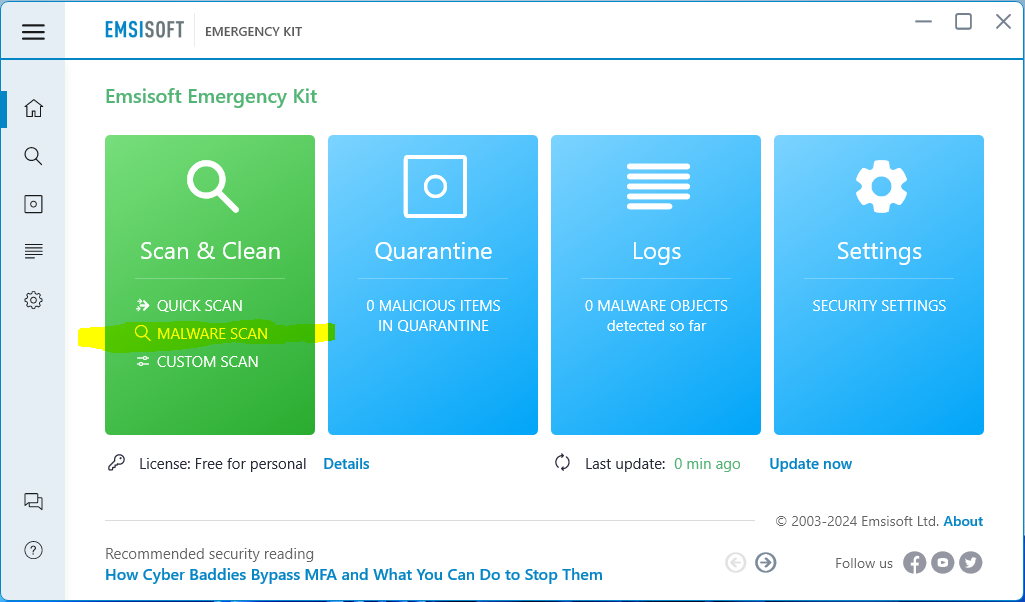 EEK is now up to date and ready to start a malware scan. Select "MALWARE SCAN" from the Scan & Clean list.