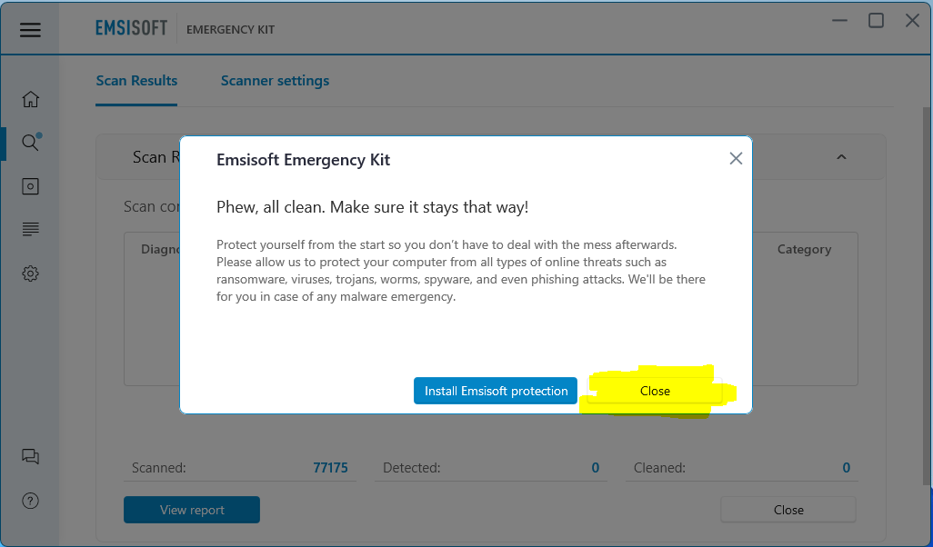 At the end of the malware scan Emsisoft invites you to install their antivirus software. This is optional, select Close to return to the scan results.