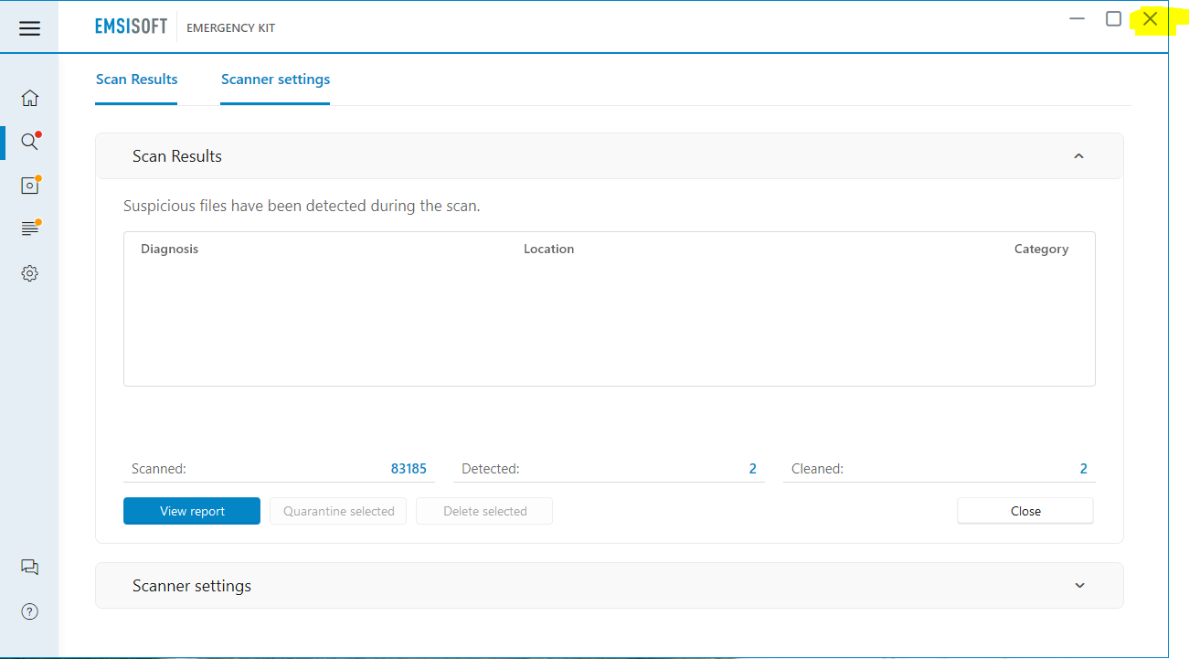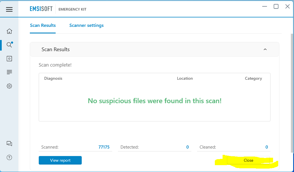 If all went well you should see a clean scan result. To finish select Close. You can move on to the next section of the tutorial.