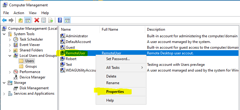 Navigate to: Computer Management (local) --> Local Users and Groups --> Users
