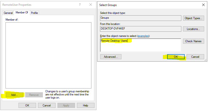 Select "Add" and enter "Remote Desktop Users" in the "Enter the object name to select" field.