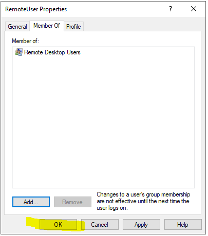 Your newly created Remote Desktop user is ready. Optionally, you can add the "Remote Desktop Users" group to an existing Windows user profile.